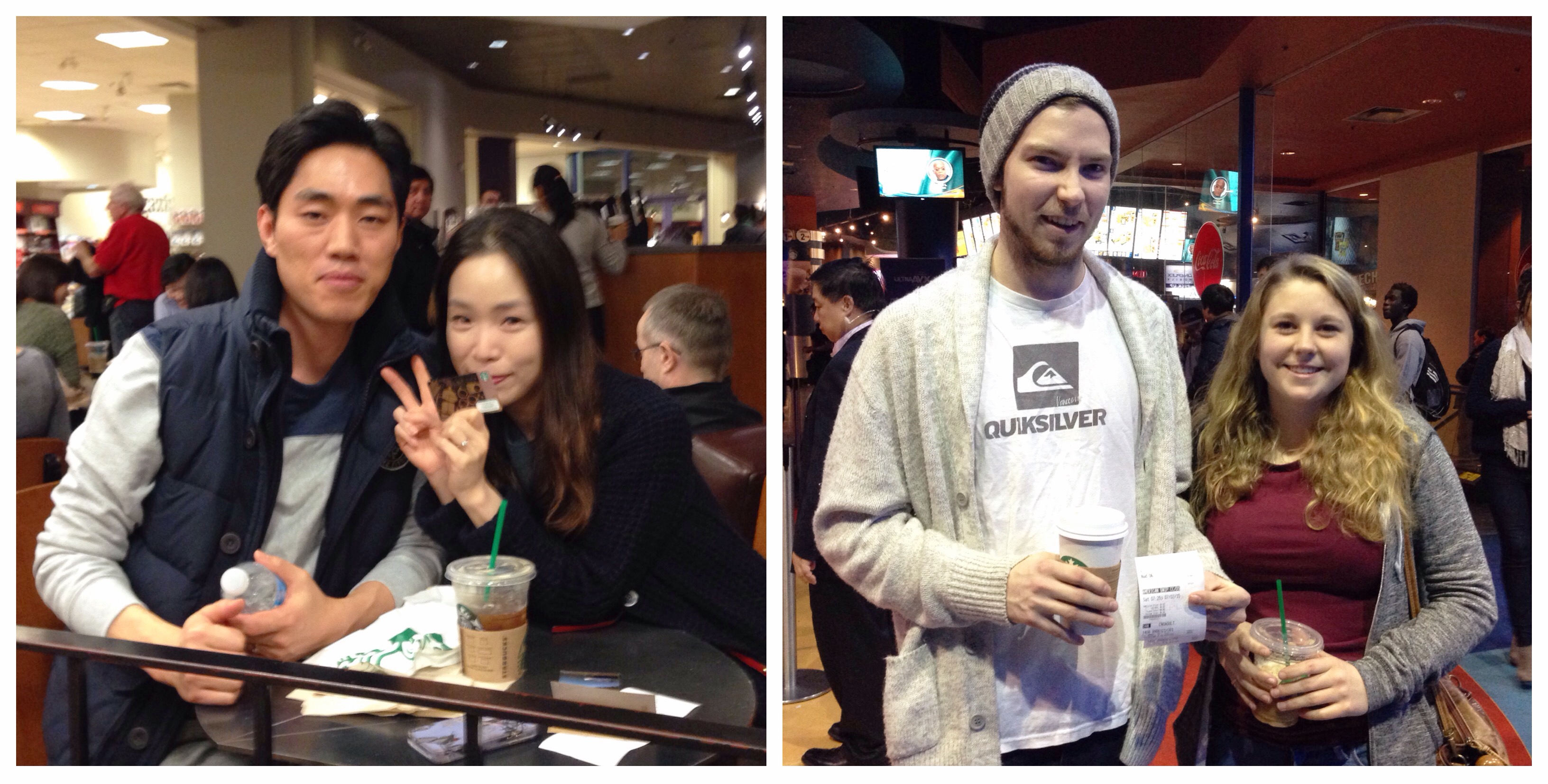 First stop: coffee shop. At Starbucks, there were students doing homework, parents taking a breather, friends hanging out, and singletons catching up on reading. In the far corner, we spotted a couple attempting to take a selfie together. Bingo. We chatted with them for a few minutes (they have been dating for 1.5 years) before offering to treat them to their next coffee date together. Bewildered, she asked, “Are you serious?!” Absolutely. Enjoy.